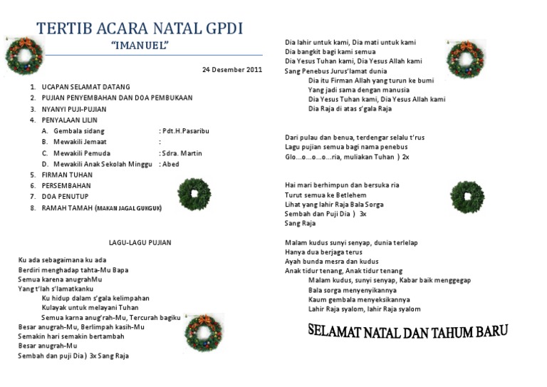 Adapun susunan acara kita pada hari ini sebagai berikut. Penutup hadirin, marilah kita awali acara ini dengan doa agar apa yang kita lakukan hari ini dapat membawa kebaikan bagi kita semua, berdoa mulai. Vokal group putri sion gbt cimahi 4. Natal sekolah minggu 2012 source: Rundown acara kebaktian dan perayaan natal 2010 an contoh liturgi natal.
